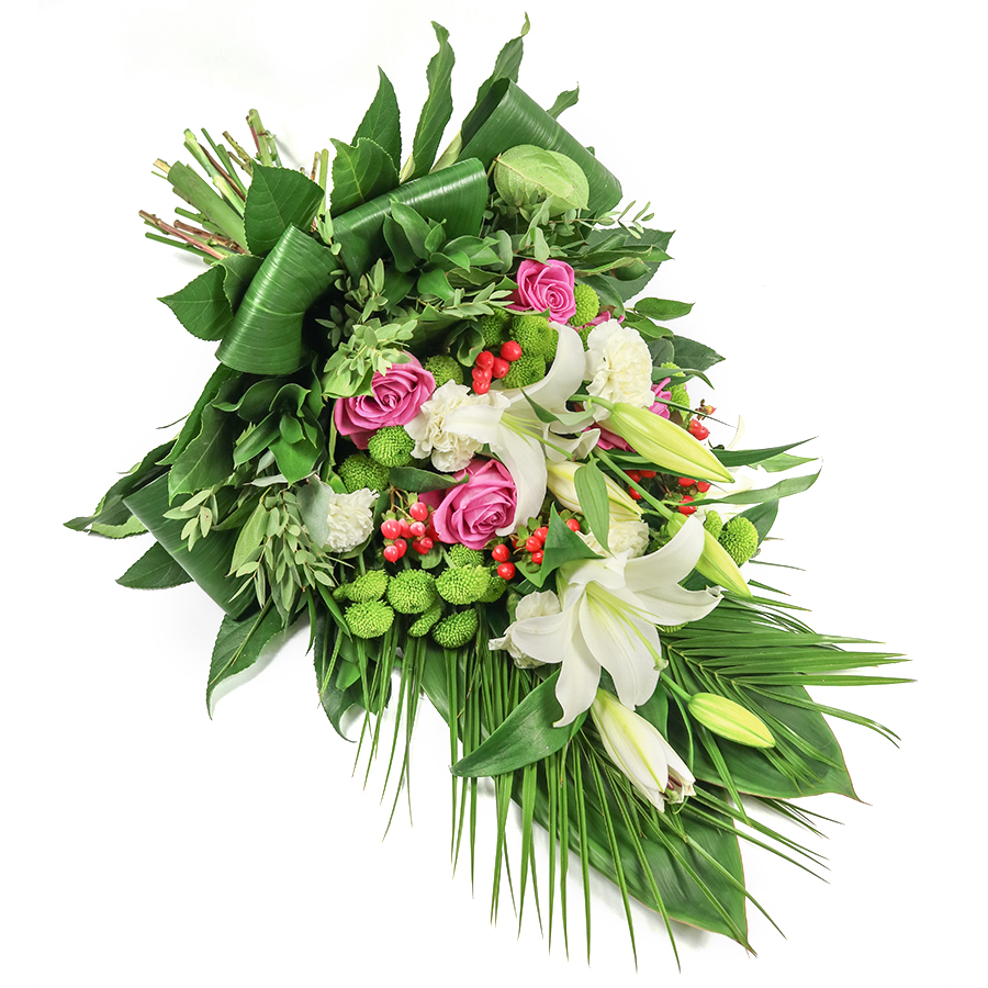 A cascade of sorrow and solace, this funeral spray is masterfully arranged with the finest blooms by a Farnborough florist known for heartfelt service. The stark white of full and budding lilies commands the eye, their petals glowing softly as if illuminated by the gentle afternoon light through a window facing Farnborough's leafy streets. Around the lilies, deep and gentle pink roses open quietly, blending seamlessly into the arrangement with warmth and reverence. Cushioning these, delicate white spray carnations impart soft volume and provide a tranquil counterpoint to the bolder petals. Striking green santini chrysanthemums, with their mossy texture, and glimmering red hypericum berries are tucked artfully throughout, bringing both playfulness and vibrancy that recall Farnborough's parks in bloom. Each piece of foliage, from glossy, broad aspidistra-like leaves to feathery, trailing palm fronds, is placed with intention, building a lush, supportive base for the flowers above. The diagonal flow of whites, pinks, greens, and reds guides the heart gently from one element to the next, creating a message of peace, comfort, and remembrance. Perfect for a tribute at a Farnborough funeral or memorial, this arrangement eloquently expresses what words cannot, crafted with local care and expert hands.