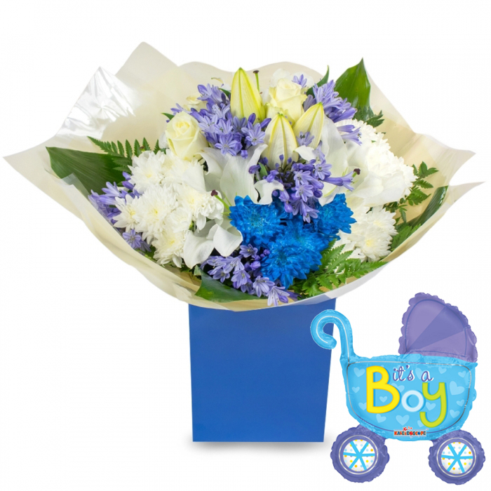 Paired with a delightful baby boy balloon, this bouquet makes a thoughtful and luxurious gift for new parents.