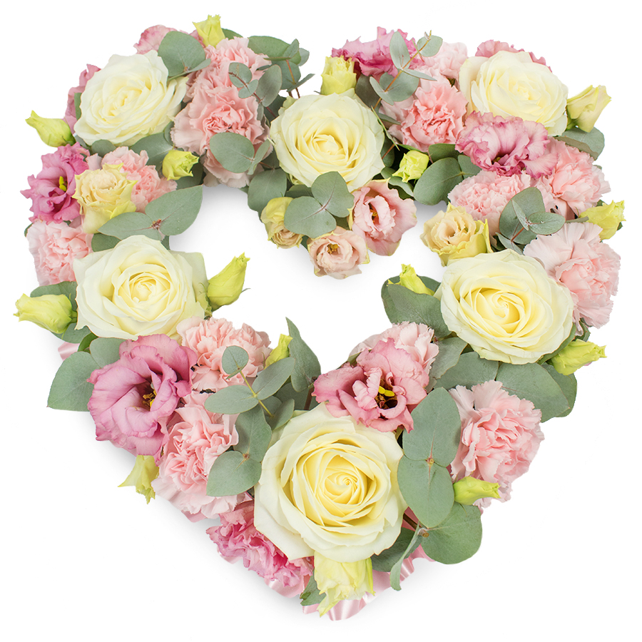 Express your love and gratitude with the Truly Loved Tribute, a beautifully crafted open heart funeral flower arrangement from Flower Delivery Farnborough. Designed to honour the memory of someone special, this elegant tribute features premium white roses, soft pink carnations, delicate pink lisianthus and fresh eucalyptus for a timeless, feminine look.