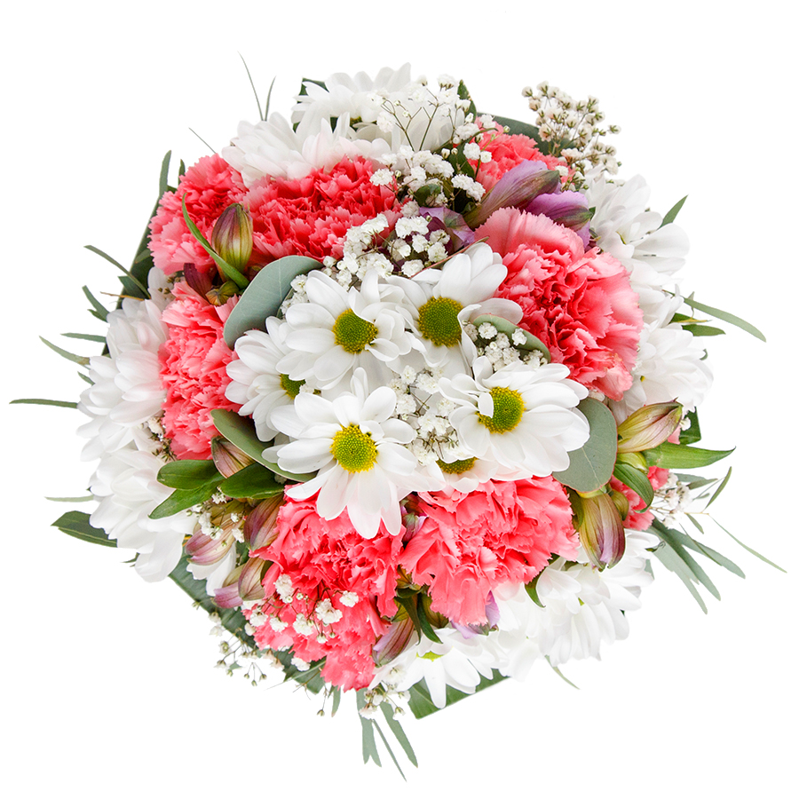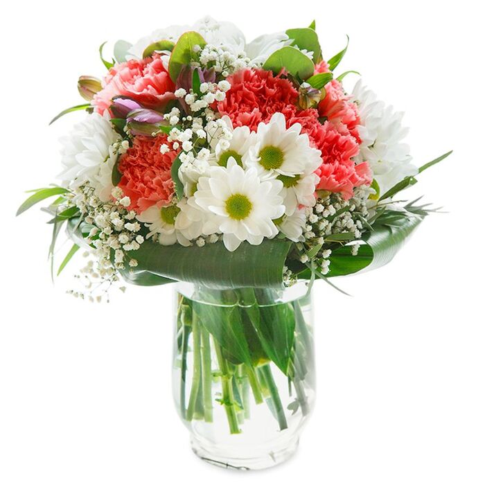 Delight in the vibrant beauty of our spring-inspired bouquet, designed to brighten any day. This unique mix showcases snow-white chrysanthemums intertwined with airy gypsophila, complemented by light pink carnations and rich aspidistra leaves, offering a perfect balance of colors and elegance.